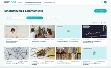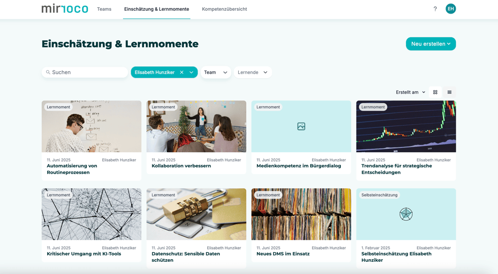 Die Lernmomente erscheinen neu in einer modernen Kachelansicht, die auch hochgeladene Fotos sichtbar macht – ideal für visuelle Rückblicke auf erlebte Lernprozesse. Eine optimierte Listenansicht ist per Klick auf das Listenicon rechts oberhalb der Lernmomente nach wie vor verfügbar.