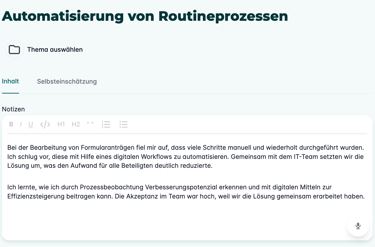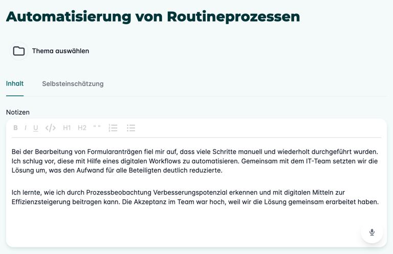 Klickt dazu auf das Mikrofonsymbol beim Lernmoment, startet die Aufnahme, und übernehmt oder verwirft diese je nach Wunsch. Es können mehrere Aufnahmen nacheinander gestartet werden und der transkribierte Text wird am Schluss angefügt, so dass nicht alles auf einmal aufgenommen werden muss.